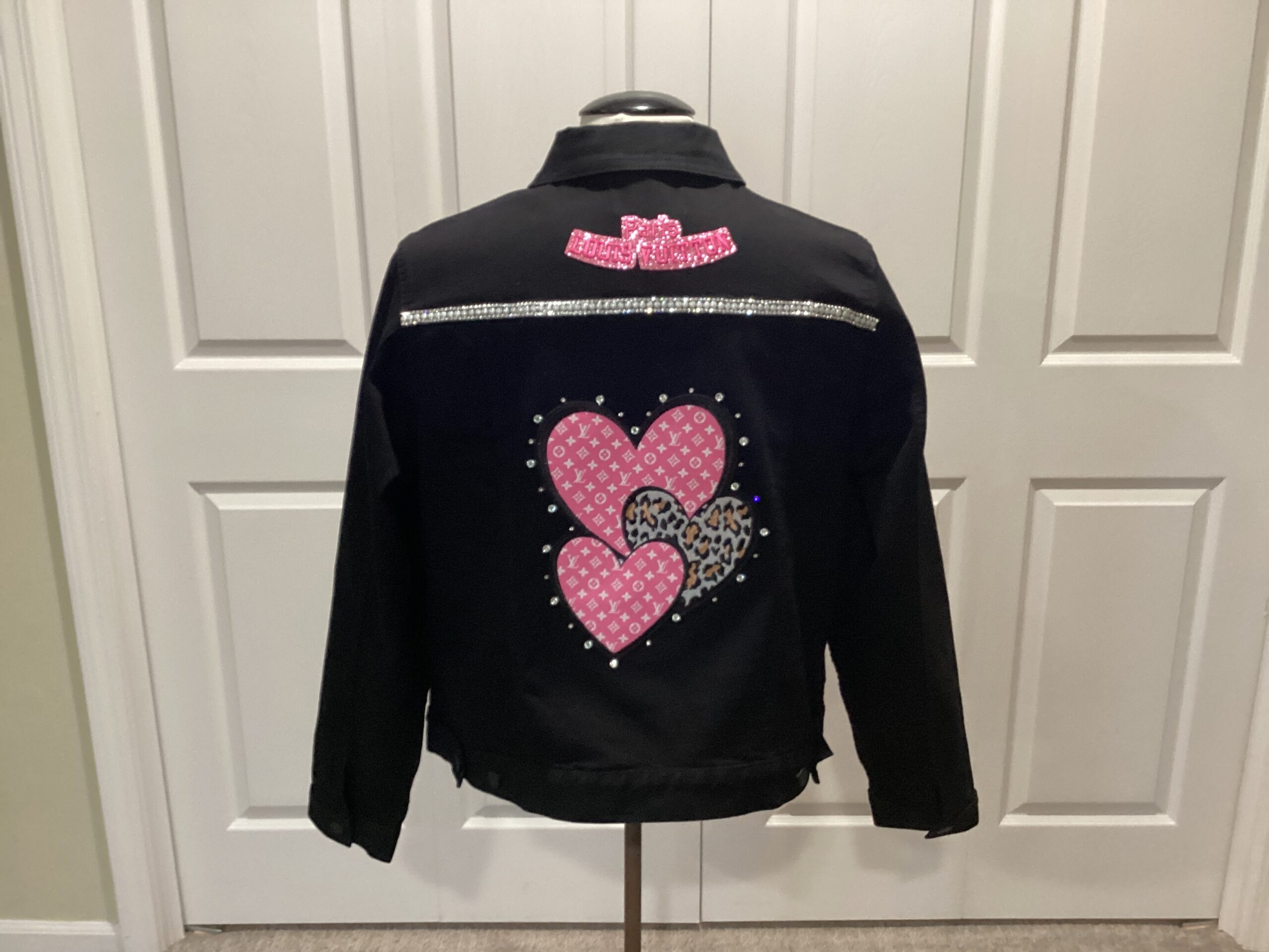 Black Denim Jacket/pink hearts trimmed with rhinestones/Back