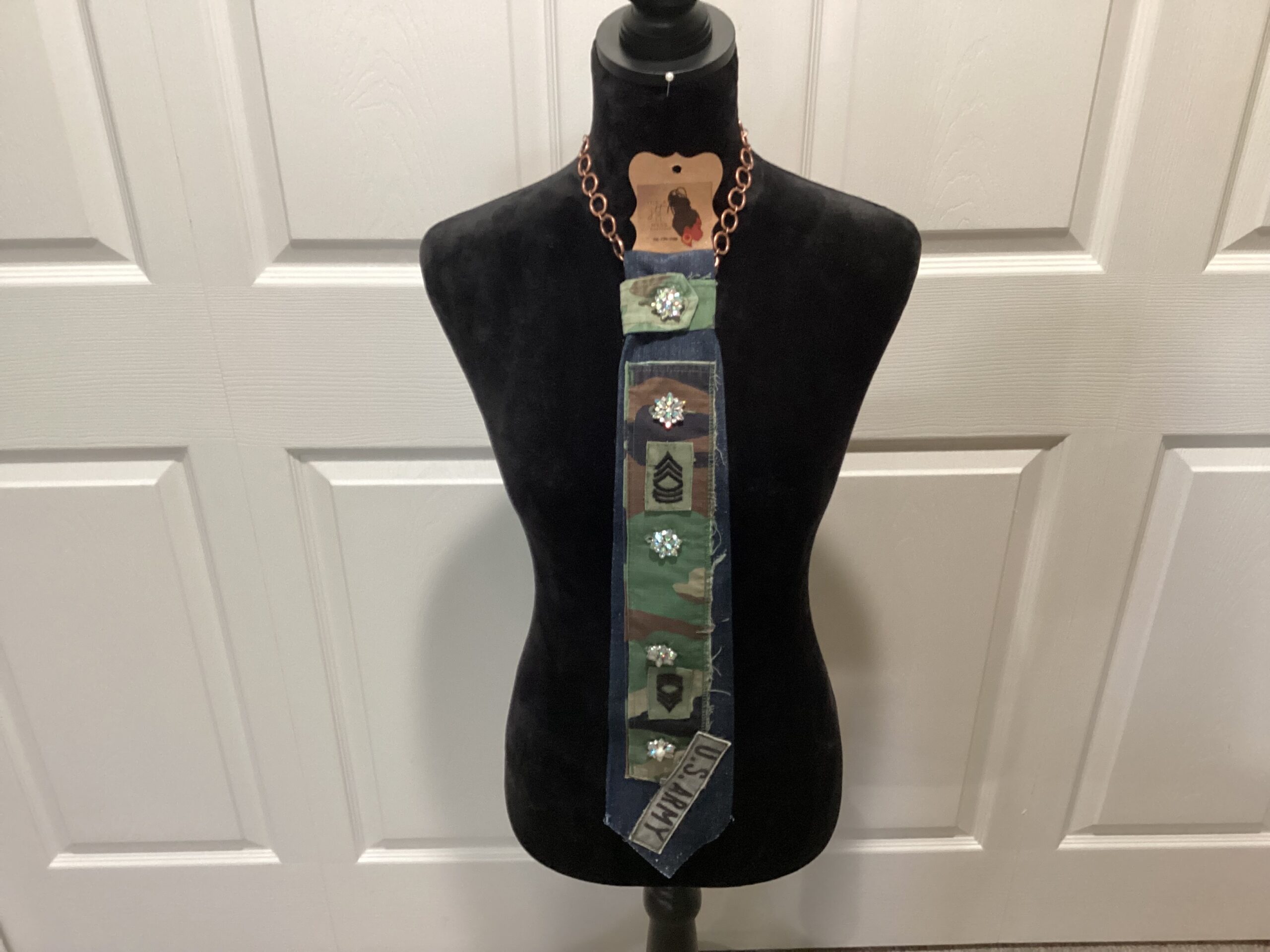 US Army camouflage denim tie with iridescent buttons and brass necklace