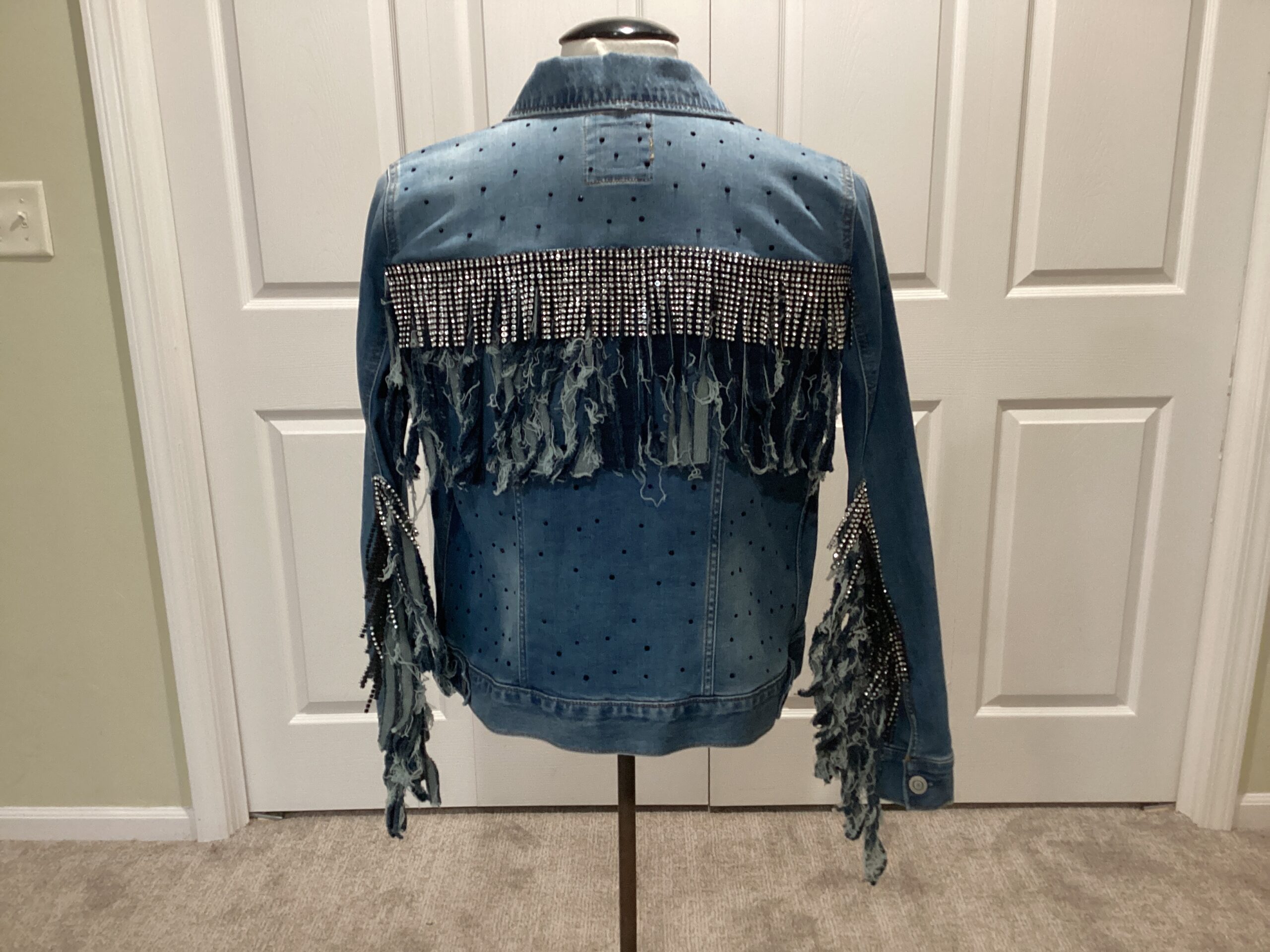 Medium denim blue Jean jacket with secrets, trim, and fringe size large (Back Jacket)