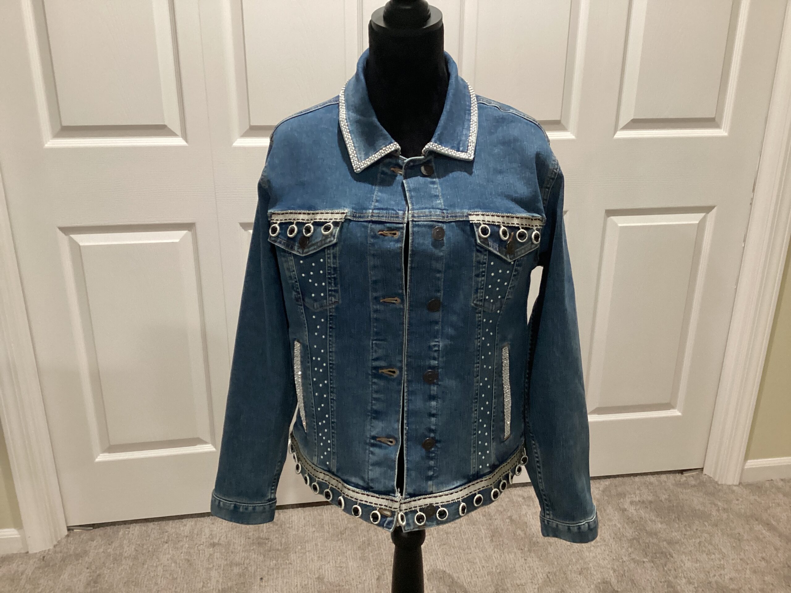 Denim Jean jacket, trimmed in rhinestones and pearls size large (Front)