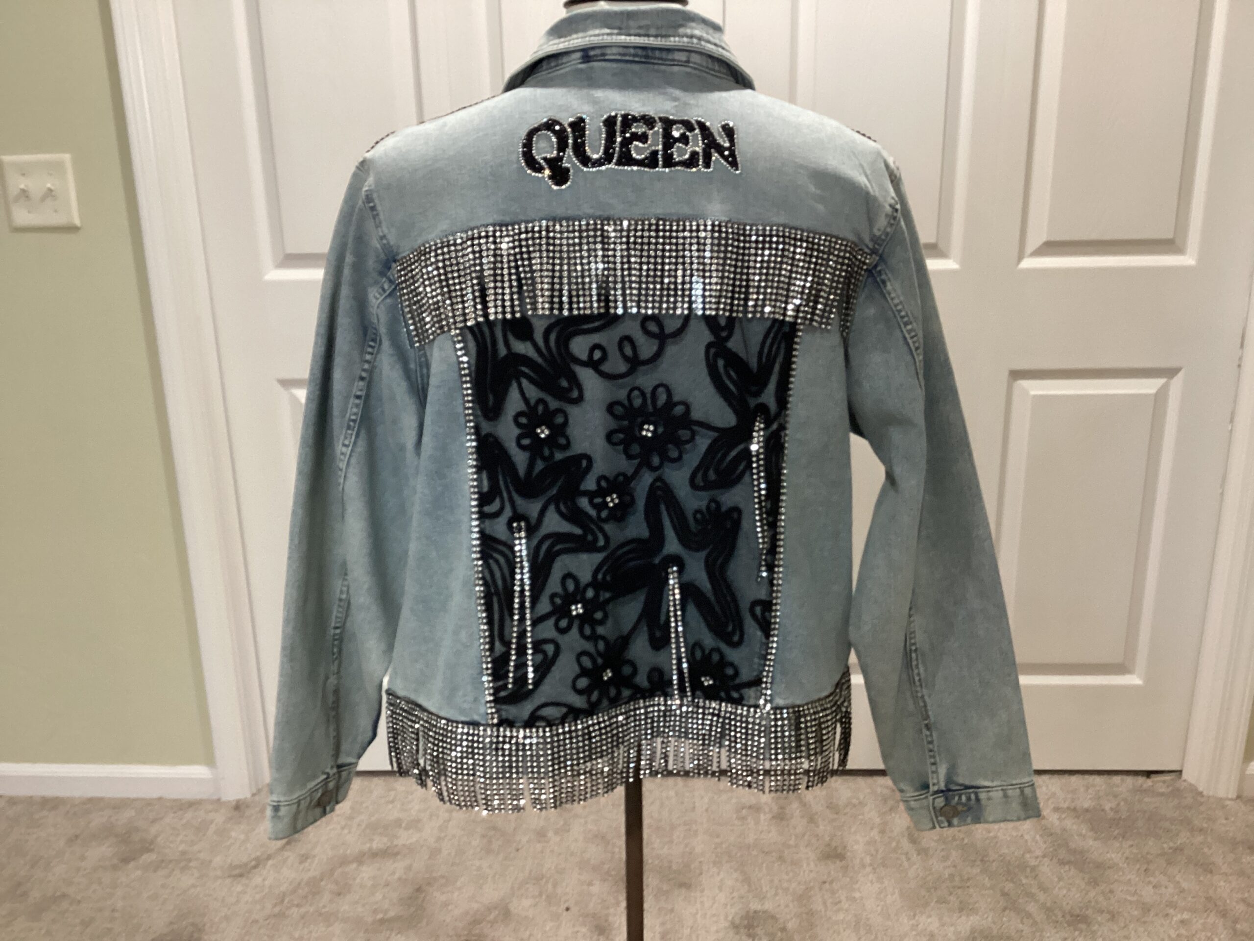 Light blue denim jacket with sequence GUEEN on the back with black rhinestone fringe and appliqué on the back size 22