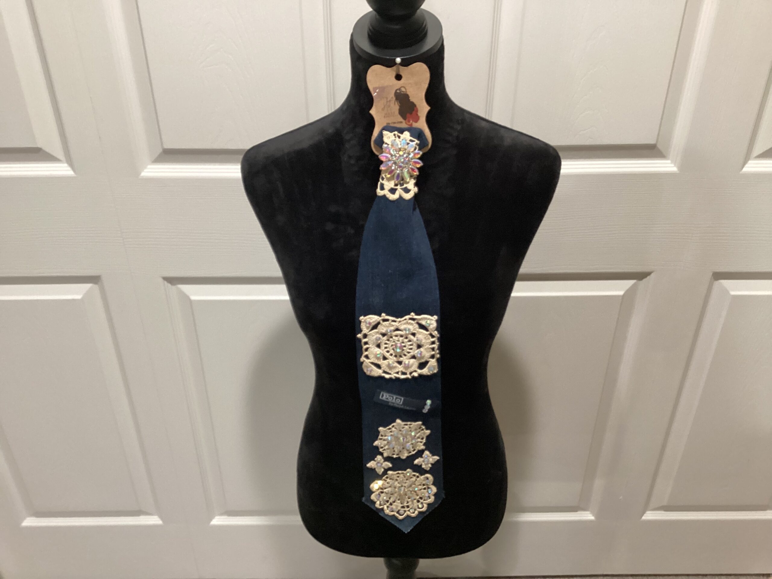 Navy blue tie\a Iridescent brooch/lace/rhinestone