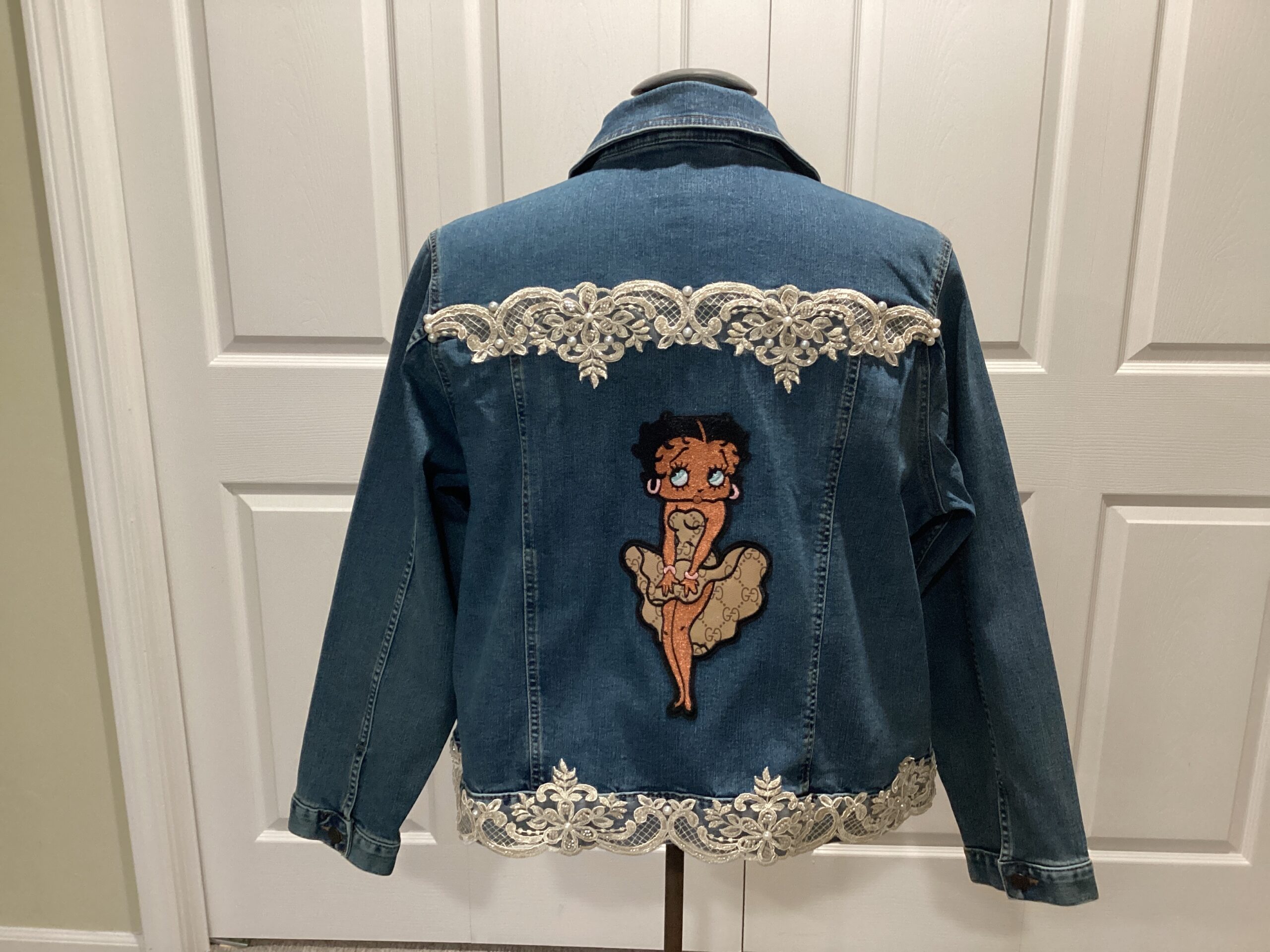 Light blue denim jacket trim with ivory lace with Betty boo on the back Size-XL