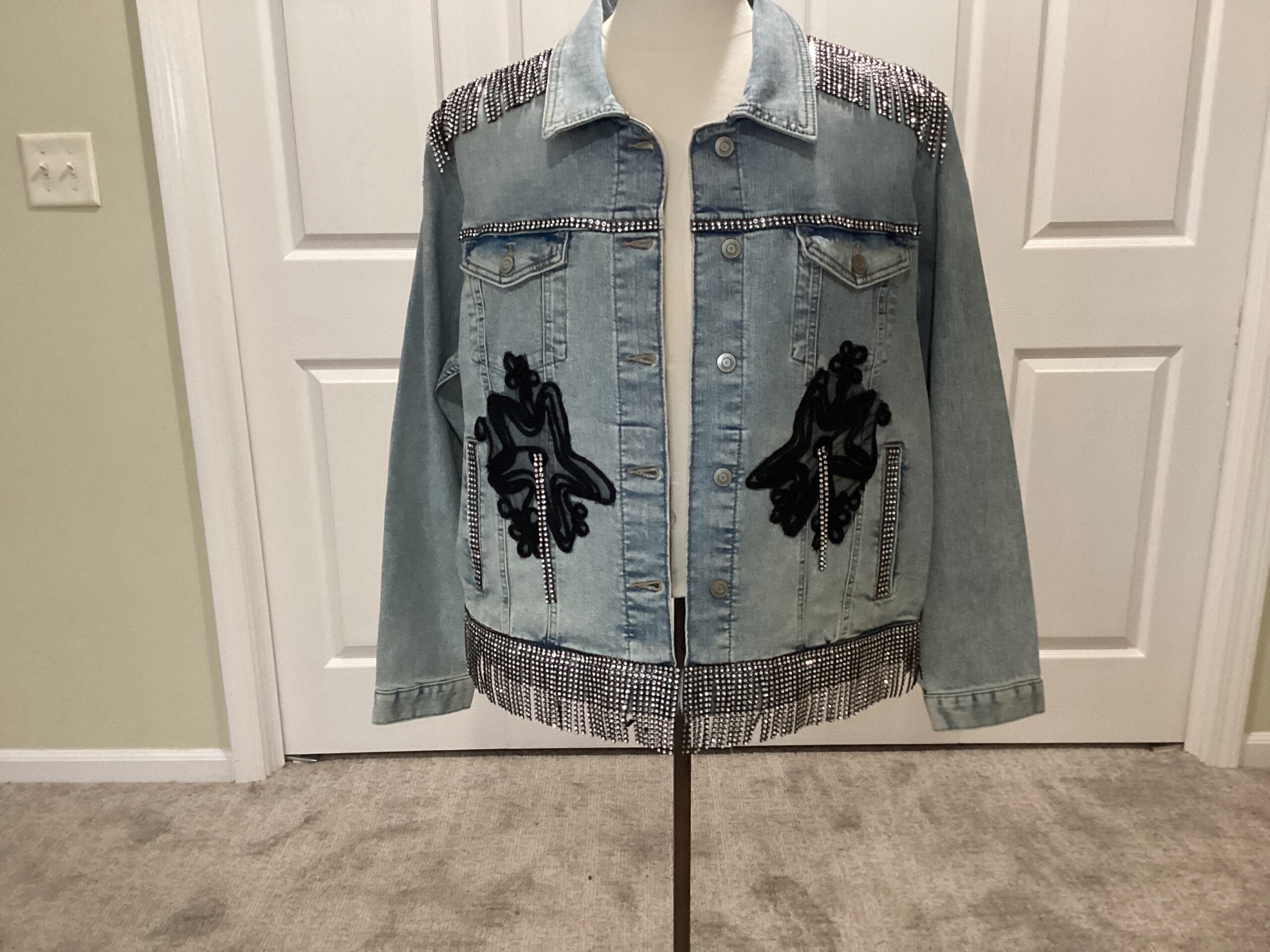 Denim jacket trim in black rhinestone fringe appliqué on both sides ( size 22 )
